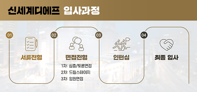 채용을 준비하는 과정은 곧 자기 자신을 새롭게 발견하는 여정이기도 하다. 장기적인 관점에서 비전을 세우고 ‘왜 내게 신세계디에프가 필요한지, 신세계디에프는 왜 내가 필요한지’ 고민해 보자. 이 여정을 통해 자신만의 이야기와 가능성을 발견했다면 신세계디에프의 문을 두드리길 추천한다.