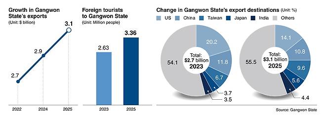 According to the Ministry of Data and Statistics’ tentative data, Gangwon’s gross regional domestic product grew 3.9 percent in 2025 to a record 64.6 trillion won ($45 billion), while exports rose 5.5 percent to a record high of $3.06 billion.