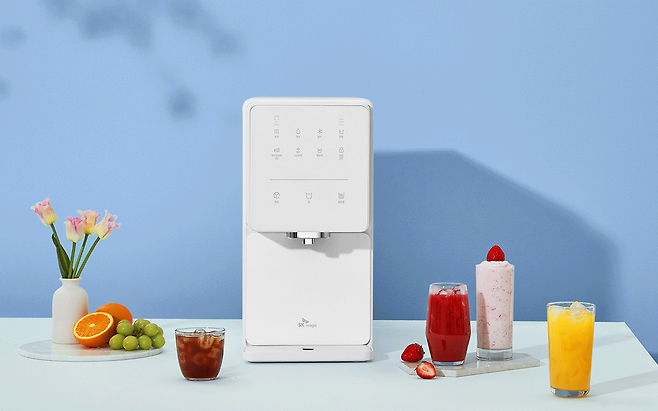 물 따로, 얼음 따로 받아야 하는 일반적인 얼음 정수기와 달리 SK매직 원코크 얼음 정수기는 하나의 토출구에서 얼음과 물이 동시에 나오며, 얼음물이 나오는 양도 버튼 하나로 4단계까지 조절할 수 있어 아주 간편하다. 일일 제빙량은 6.3kg.
