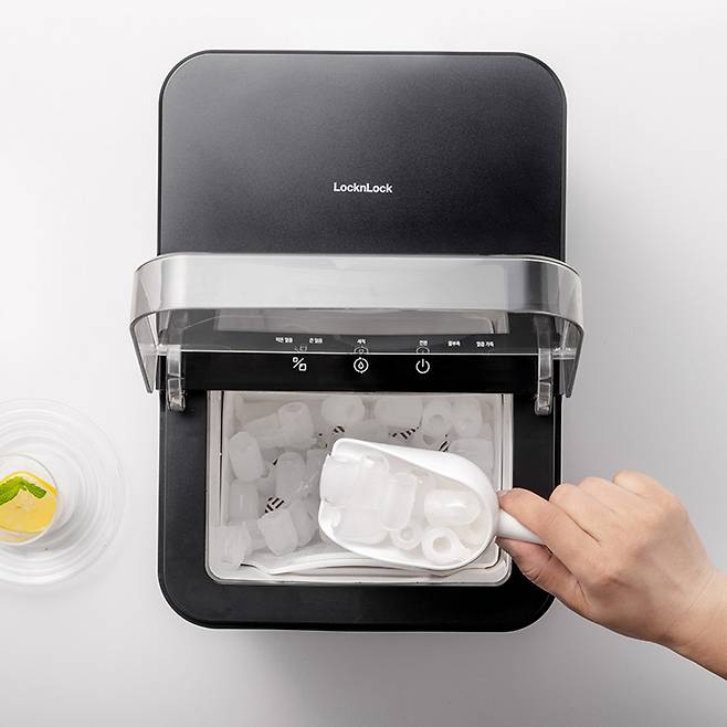 락앤락 제품은 얼음 크기를 큰 얼음, 작은 얼음 2단계로 선택해 얼릴 수 있으며 자동 세척 기능이 있어 위생적이다. 얼음 저장량은 1.2kg, 일일 제빙량은 12kg.