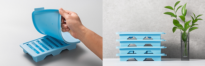 뚜껑을 덮어 위생적이면서 냉동실 냄새가 스며들지 않은 깨끗한 얼음을 만들 수 있고, 차곡차곡 쌓아 비좁은 냉동실 안에서도 효율적인 보관이 가능하다. 부드러운 실리콘 소재로 트레이를 잡고 비틀면 얼음이 쉽게 빠지며 열탕 소독도 가능해 더욱 위생적이다.