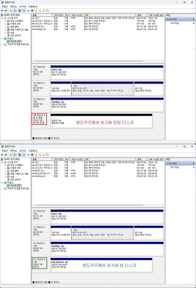 이 GUID를 가지고 윈도우즈의 디스크관리에 들어갔을 때 아래와 같이 '초기화 안됨'과 '온라인'으로 구분해서 사용하고 있습니다.