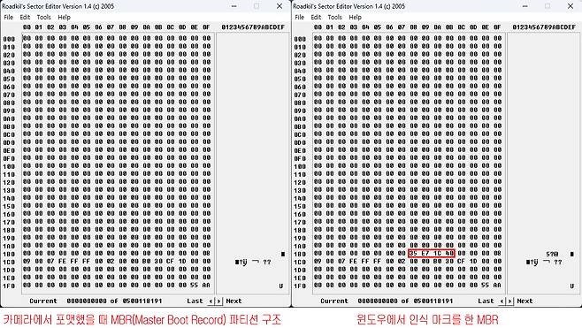 먼저 아래 왼쪽 그림은 카메라에서 메모리를 포맷했을 때 MBR 내용이고 오른쪽은 윈도우에서 디스크를 초기화(온라인) 했을 때 MBR 상태입니다.