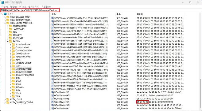 그래서 도대체 무슨 코드를 기록한거지 ? 하고 찾아보니 아래와 같이 윈도우즈의 레지스트리에도 발견한 디스크와 코드를 기록해 둡니다.