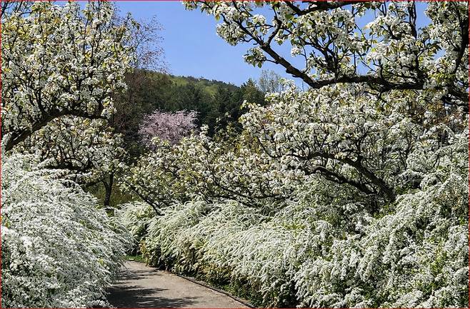 이 수목원의 가장 큰 매력은 봄철에 만날 수 있는 꽃 터널입니다. 약 170m 길이로 이어지는 배꽃과 조팝나무의 조화는 마치 하얀 폭포가 흐르는 듯한 풍경을 연출합니다. 여기에 분홍빛 박태기꽃까지 더해지면서 수목원 전체가 한 폭의 그림 같은 분위기를 자아냅니다. 그래서 사진 촬영 명소로도 인기가 높으며, 가족 나들이나 연인과의 데이트 코스로도 많은 사랑을 받고 있습니다.