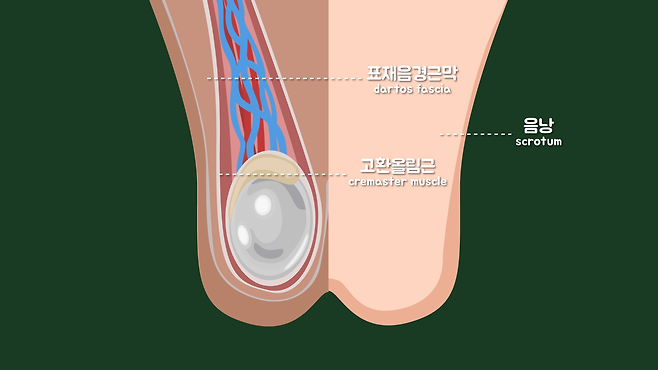 고환(testis)은 남성의 생식기관 중 정자를 생성하는 기관입니다. 이 기관은 음낭(scrotum)이라는 피부낭에 감싸져 있는데, 음낭은 기본적으로 표재음경근막(dartos fascia)과 고환올림근(cremaster muscle)에 의해서 늘어져 있고, 이때가 이완 상태입니다.