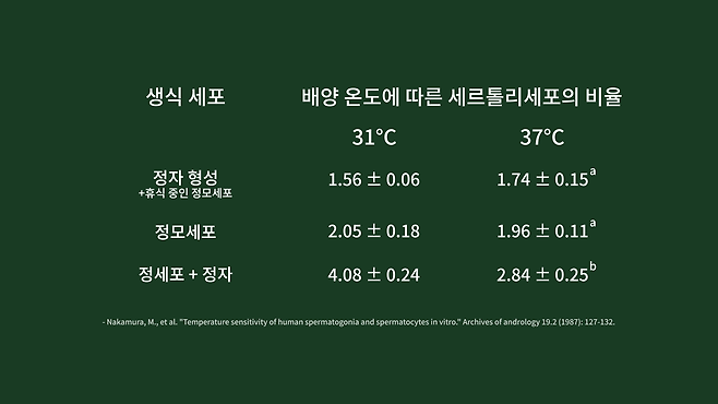 정자발생 과정이 온도가 높을 때 이뤄지는 경우 정자 형성 및 세포분열(감수분열) 과정에서 문제가 생길 수 있습니다. 이외에도 여러 가지 이유로 31~33℃의 온도가 정자 생성에 적합하기에 그 온도를 유지하려고 하는 겁니다. 그런데 단순하게 음낭이 늘어나고 쪼그라드는 것만으로 해당 온도를 유지할 수 있을까요?