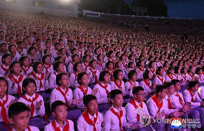 (평양 조선중앙통신=연합뉴스) 북한 조선중앙통신은 당창건기념일(이달 10일)을 앞두고 전국 학생소년 예술선전대 종합공연이 4일 평양시 청년공원 야외극장에서 개최됐다고 5일 보도했다. 2025.10.5