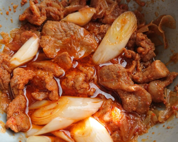 여기에 간장 1큰술, 맛술 1큰술, 다진 마늘 1작은술, 설탕 1작은술, 고춧가루 1큰술을 함께 섞으면 두반장의 짠맛은 중화되고, 제육볶음 특유의 매콤달달한 조화가 살아난다. 두반장은 팬에 먼저 살짝 볶아 향을 내는 방식이 효과적이므로, 양념을 바로 섞기보단 한 번 볶아주는 단계를 거치는 것이 좋다.
