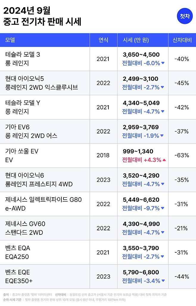 중고차 전문 업체 첫차에 따르면 2024년 9월 기준 아이오닉5는 신차 대비 45% 저렴한 가격에 거래되고 있다. 그럼에도 불구하고 매물은 계속 쌓이고 있는 상황이다.