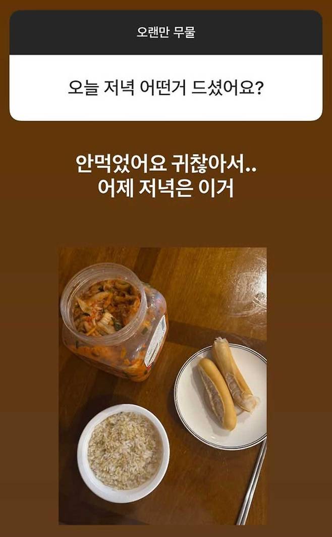 또한 저녁 식단에 관한 질문에는 직접 찍은 사진을 공개하며 소통을 이어갔다. 닭가슴살 소시지, 김치, 현미밥으로 구성된 식단을 올리며 최근 자신이 실천 중인 식습관을 공유한 것이다.