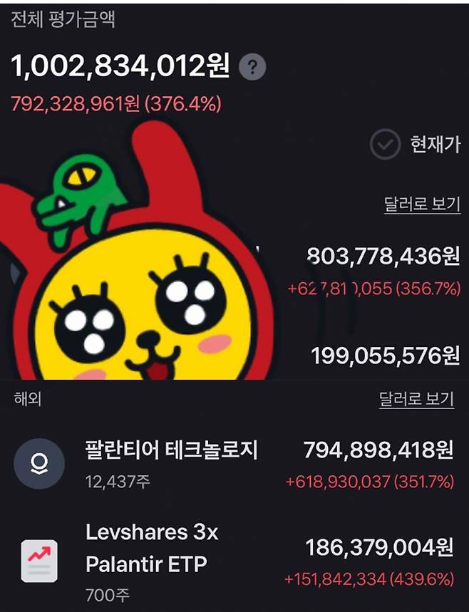 이 사람이 올린 인증사진에 따르면 현재 376%의 수익률을 기록, 10억280만원 가량을 보유중이다. 보유 종목은 팔란티어와 팔란티어 수익률의 3배 추종 상장지수상품(ETP) 등이다.