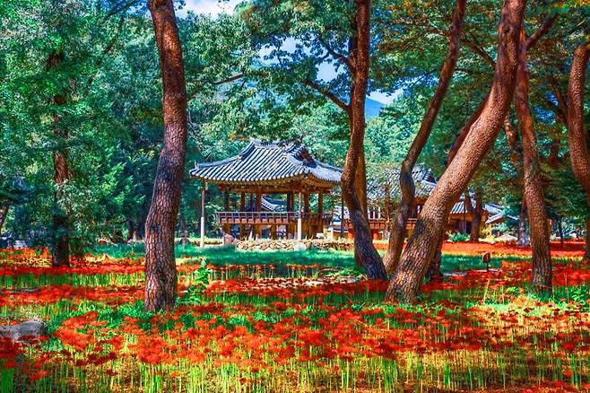 갈계숲은 덕유산 기슭에서 흘러내리는 시냇물이 자연스럽게 만든 섬과 울창한 나무들, 오래된 정자와 고택이 어우러져 마치 한 폭의 동양화를 보는 듯한 풍경을 자아내는 곳입니다.