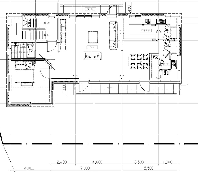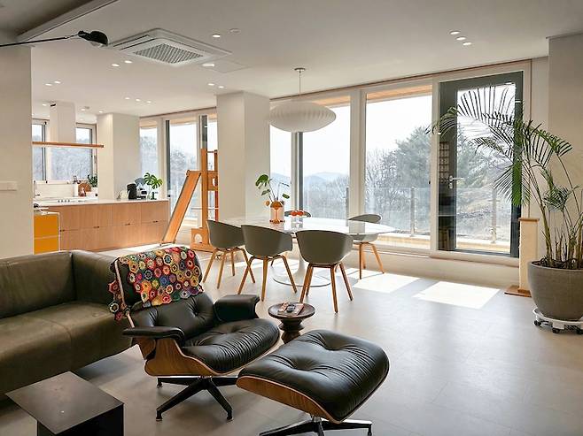 원래 그려진 도면과는 다르게 큰 테이블을 거실 쪽으로 옮겨 배치하곤 저 테이블 위에서 식사 포함 개인 업무와 전 창 밖의 목장 풍경을 보며 염소 멍까지 누리는 등 정말 많은 일들을 하고 있습니다.