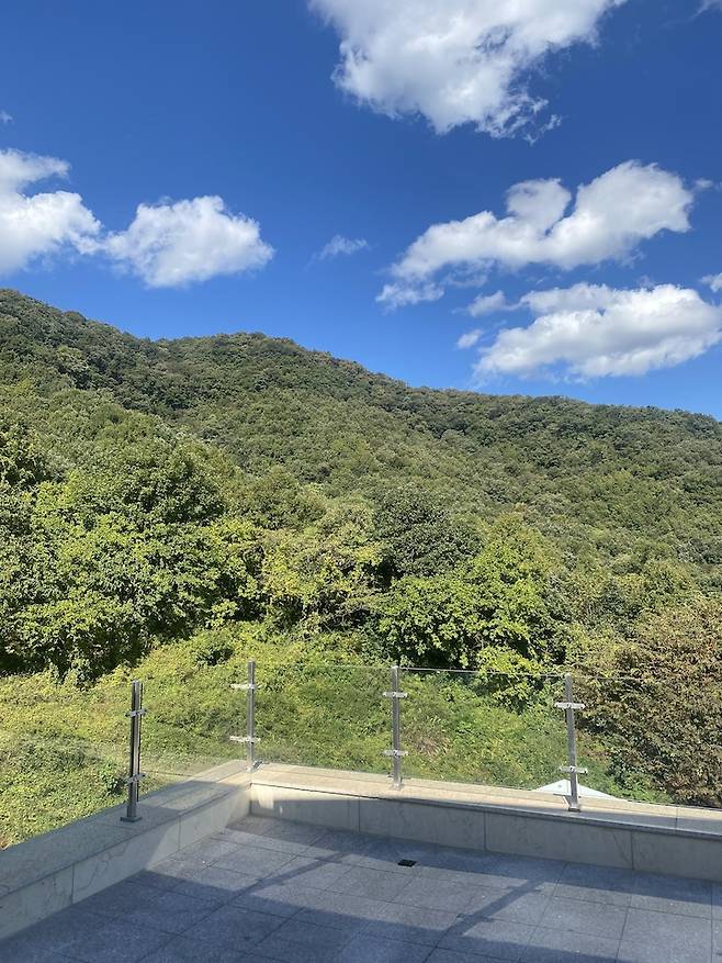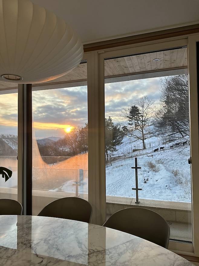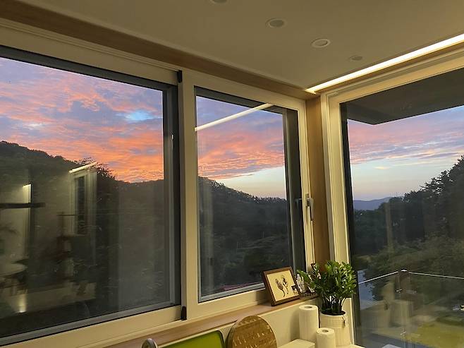 매일 아침 테이블에서 바라보는 풍경이 큰 힘을 준답니다. 산 속 주택으로 이사 후 매일의 하늘이 이렇게 다르고 멋지다는 걸 처음 알게 되었어요. 그리고 저희 집만의 뷰라 할 수 있죠, 산으로 산책 나가는 흑 염소뷰. 일명 흑염소 멍을 때릴 수 있는 공간이랍니다. ㅎㅎ