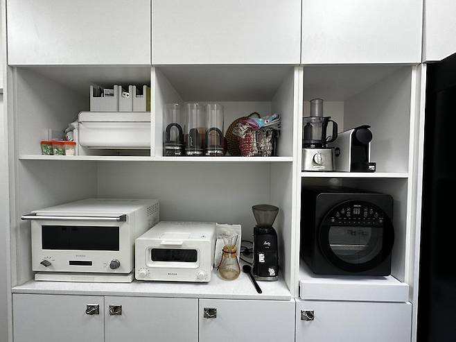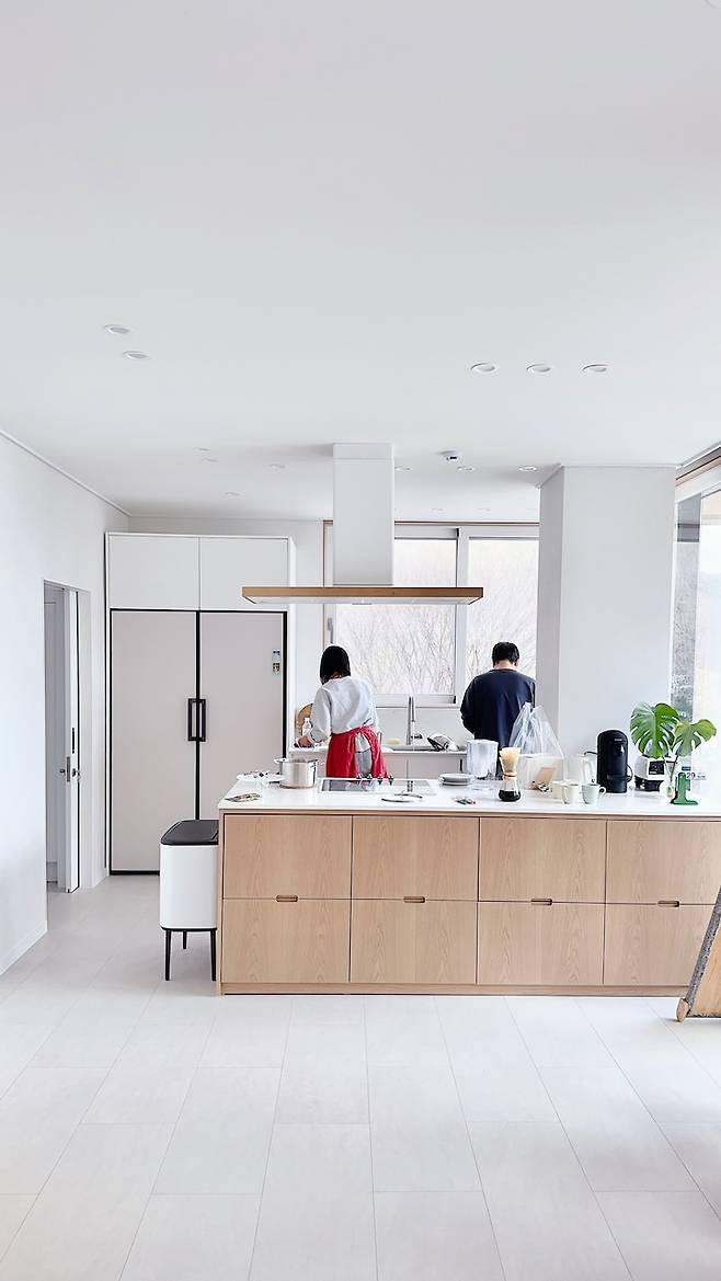 여러 번의 이사를 통해 주방 일을 즐겨 하는 저에겐 대면형 주방이 잘 맞는다 싶었어요. 그래서 대면형이라는 큰 틀을 계획하고 그 안에 가구 제작이나 가전을 선택하였습니다.