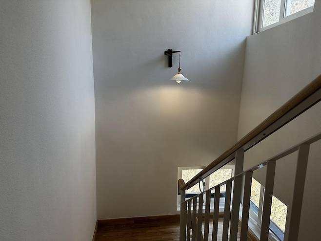 1층에서 2층으로 올라가 볼게요. 계단실은 페인트 마감을 하였구요. 계단과 바닥 마감은 목공 사장님 추천으로 멀바우 나무로 선택하였어요.