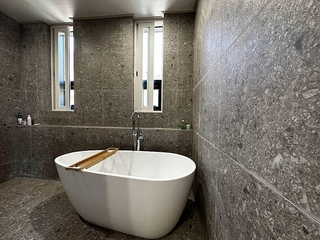 2층 화장실은 건식과 습식으로 단차와 벽을 두어 구분하였구요. 반신욕을 즐기는 제가 3년간 코로나로 사우나도 못 가며 집을 지으면 꼭 프리 스탠딩 욕조를 놓을 테다 다짐했고, 설계사님도 우리 소장님도 놀라실 만한 크기의 욕실이 탄생했습니다. 시골로 이사 후 오히려 밖을 나갈 일이 많지 않다보니 집에서 일주일에 한, 두번은 꾸준히 반신욕을 하고 있어요.
