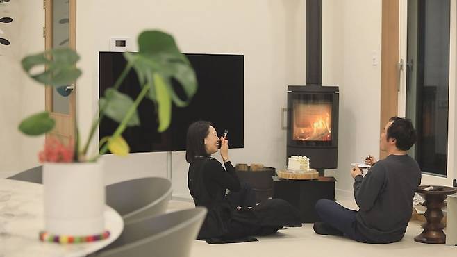 얼마 전 촬영을 했던 [건축탐구집]에서 보내주셨던 스틸 컷도 난로 앞에서 저희 가족을 잘 표현해준 것 같아 맘에 드네요. 밑의 사진엔 저희 집 난로 앞 붙박이 원, 투 되시겠네요. ㅎㅎ