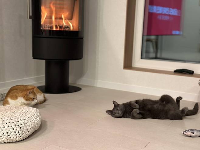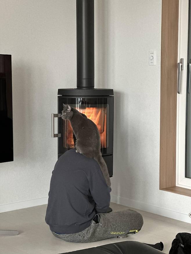 저희 집 서열 1위 남집사를 제일 좋아하는 고양이는 종종 남편과 이렇게 불멍을 즐기곤 합니다 ㅋㅋ