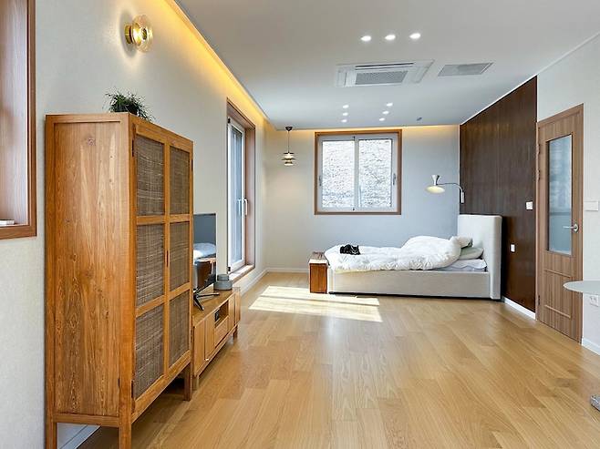마침 저희 집은 계단실이 따로 분리되어 있기에 제가 원하는 원룸형의 공간으로 계획이 가능해졌어요. 메인 침실 공간에 포근한 느낌을 주고 싶어서 2층은 1층과는 조금 다른 분위기인 우드 계열을 많이 사용했구요. (광폭 마루 바닥, 우드 포인트 창틀, 우드 실링팬) 가구의 선택에서도 우드톤과 패브릭의 가구들을 선택했어요.