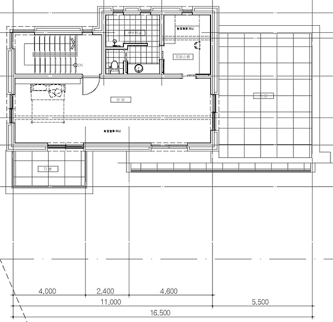 계단실 덕분에 각층에 중문을 설치하고 2층도 제가 원하는 큰 원룸형의 침실이 탄생되었어요^^ 2층은 저희 부부의 좀더 프라이빗한 공간으로 드레스룸과 욕실도 조금 크게 계획했어요. 그럼 다소 독특한 평면의 저희 집 내부 공간을 자세히 보여드릴게요.