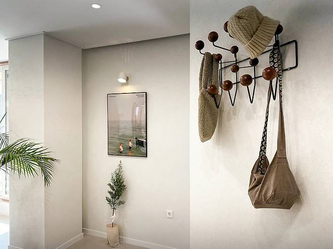 이제 1층에 하나뿐인 방을 소개해드릴게요. 방으로 가기 전 전실의 입구는 이렇게 매일 가볍게 들고 나가는 액세서리를 걸어두기 위해 행잇올을 설치했구요. 계단실 문을 열면 바로 마주하는 벽에는 기분이나 분위기에 따라 그림이나 사진을 바꿔 걸으려고 조명을 미리 계획해 두었습니다. 이사온 지 얼마 되지 않았는데 벌써 두 번째 액자가 걸려져 있네요 ^^