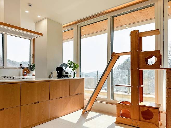 정남향으로 오전부터 깊게 들어오는 볕을 고양이들이 충분히 받고 즐겼으면 하는 마음에 캣 타워를 이쪽에 두었구요. 가끔 식사 준비할 때 캣타워에 올라간 고양이들이 절 바라보곤 합니다 ^^