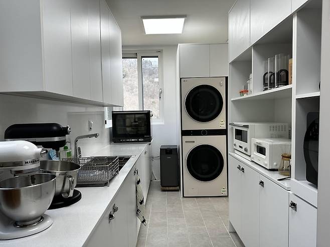보조주방 겸 다용도실인 이곳엔 메인 주방에 부족한 수납공간을 최대한 설계하였고, 싱크대와 작업대를 설치하여 문을 닫고 베이킹을 하는 제 작은 작업실이 되곤 합니다. 물건들이 밖에 나와있는 걸 좋아하지 않는 터라 메인 주방의 비움을 가려진 넓직한 보조주방에서 채워주는 역할을 해서 너무 맘에 들어요.