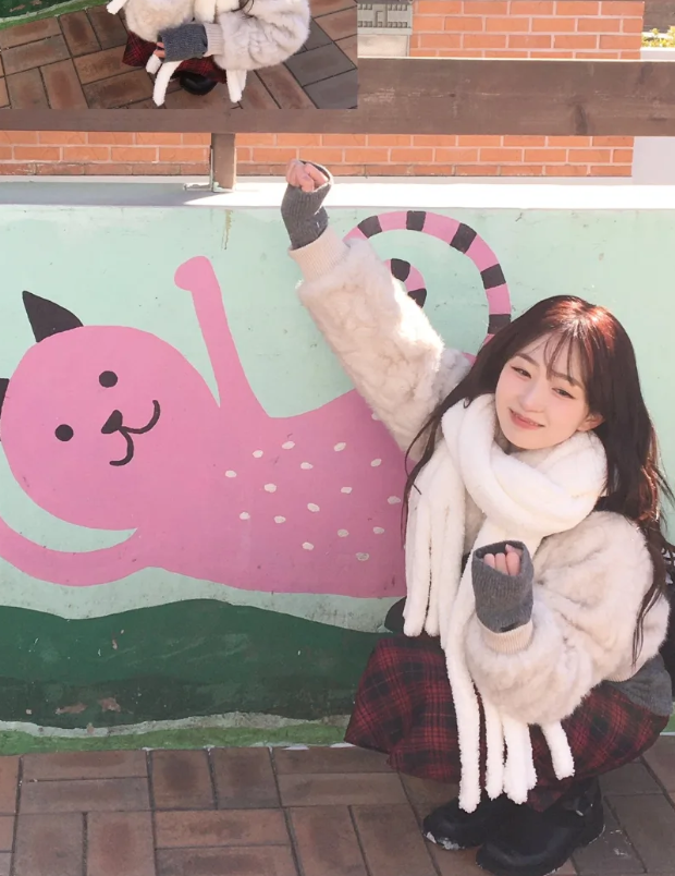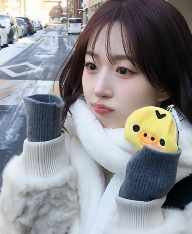 오해원 님은 몽글몽글한 질감의 화이트 목도리와 아이보리 퍼 재킷을 착용해 귀엽고 따뜻한 분위기를 완성했어요. 부드러운 소재 덕분에 포근한 겨울 감성이 느껴졌고, 화이트 계열의 아우터가 얼굴을 더욱 화사하게 밝혀줬어요.