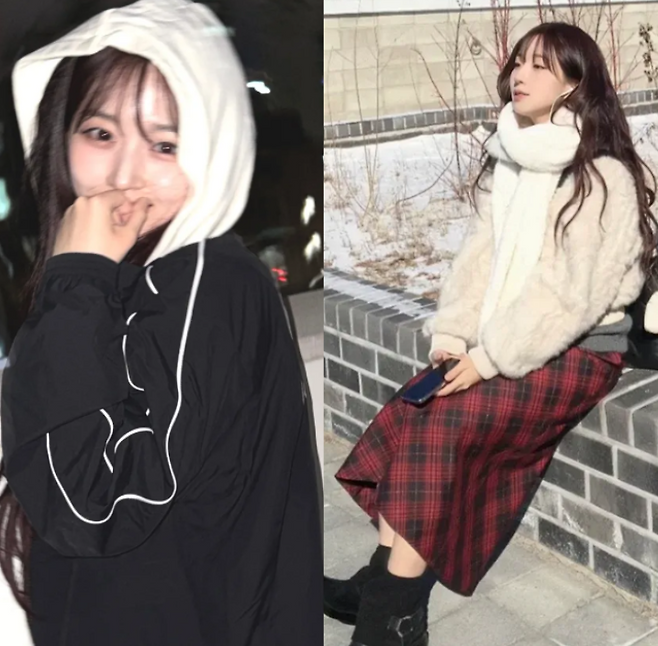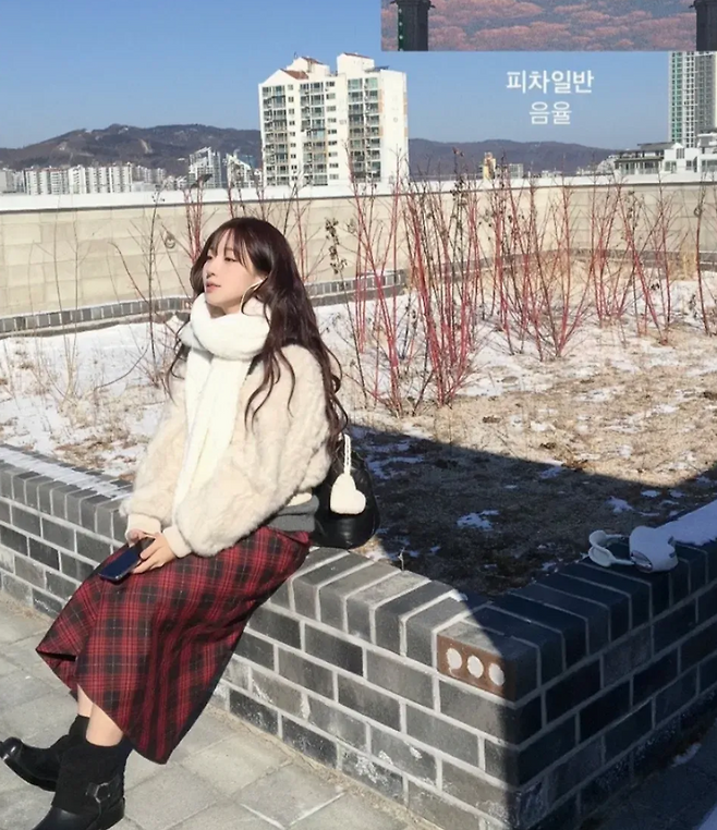 이번에 오해원 님의 일상룩을 준비해 봤어요~ 오해원 님은 몽글몽글 귀여운 화이트 목도리와 퍼자켓을 착용했는데요. 재킷 안에는 그레이 니트를 레이어드 했어요. 스커트는 빨간색 체크 롱스커트로 클래식하고 따뜻한 감성이 돋보였죠. 신발은 블랙 부츠를 착용했더라구요.
