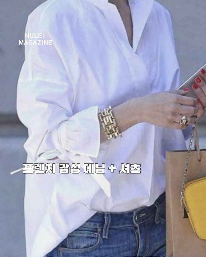화이트 셔츠를 청바지에 살짝 넣어 입으면?파리지앵 무드 가득한 꾸안꾸 스타일 탄생!넉넉한 와이드 데님이 요즘 대세죠.