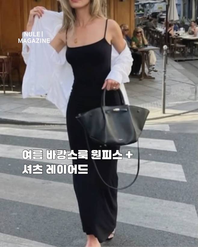 슬립 원피스 위에 화이트 셔츠 툭 걸치면시원하고 스타일리시한 레이어드룩 완성!살짝 묶어 크롭처럼 연출해도 예뻐요.
