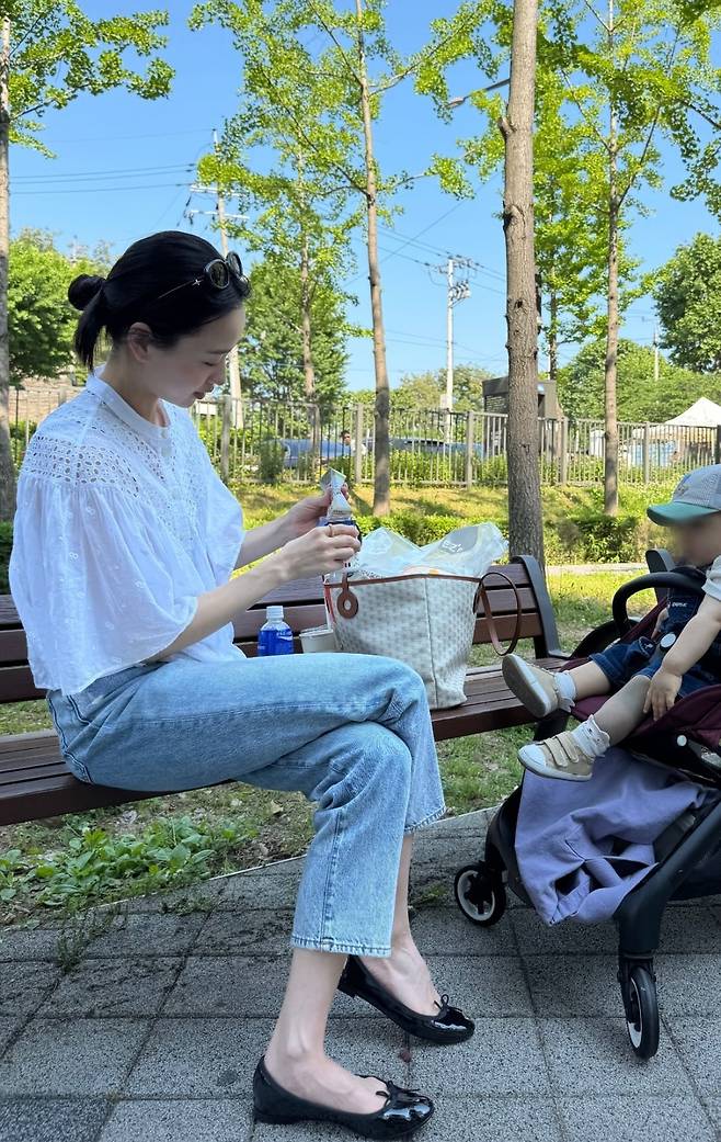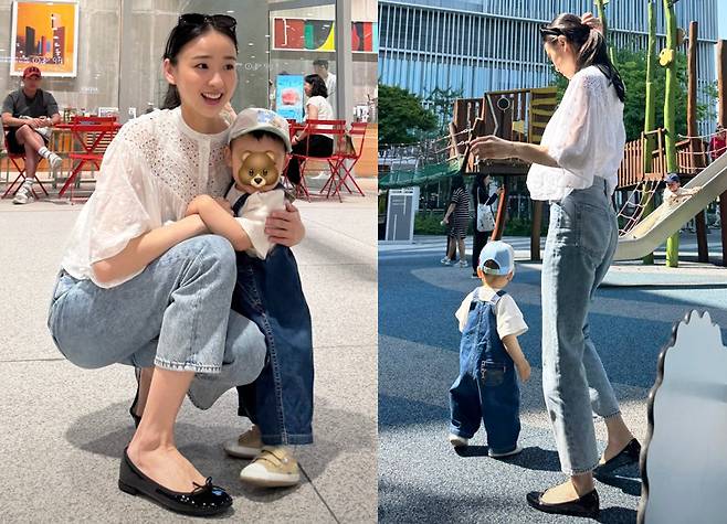 손연재는 아들과 함께 놀이터를 찾은 모습으로, 흰색 레이스 블라우스에 연청 스트레이트 데님을 매치한 내추럴한 데일리룩을 선보였습니다.