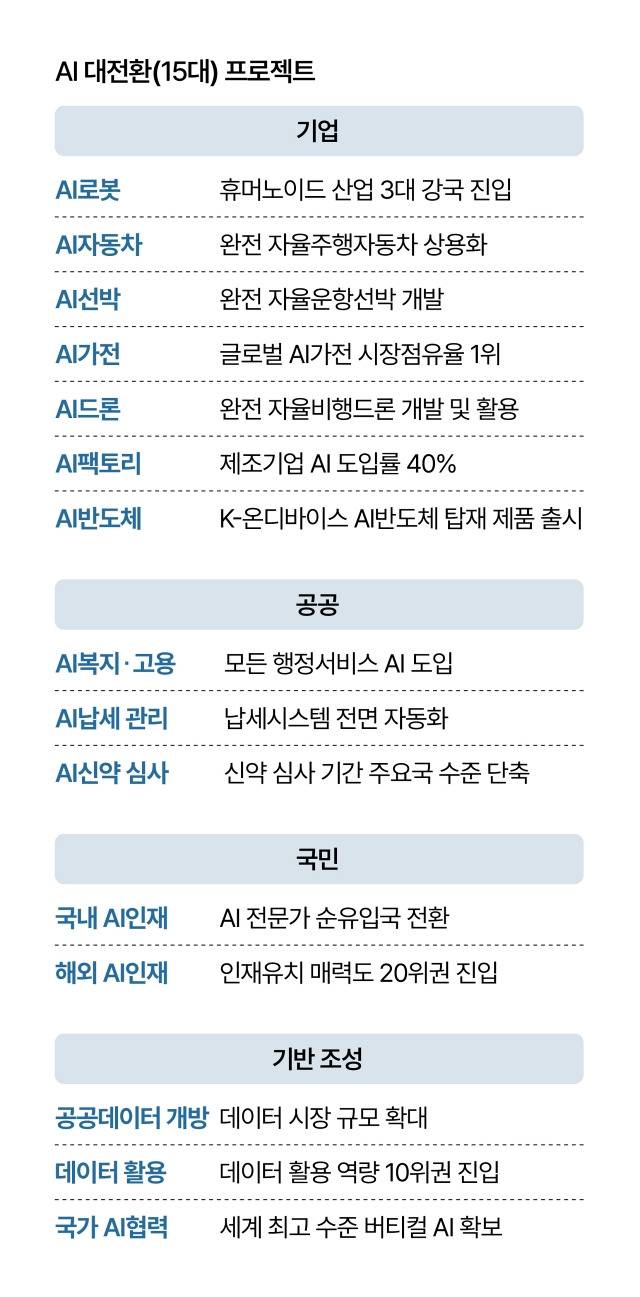 AI 대전환을 위해 기업, 공공, 국민, 기반조성 등 4대 핵심 분야에서 15대 선도 프로젝트를 추진합니다. 먼저 기업 분야에선 로봇, 자동차, 선박, 가전, 드론, 팩토리, 반도체 등 7개 산업이 프로젝트 대상으로 선정됐습니다. 정부는 기업, 대학, 출연연, 지방자치단체, 관계부처 등이 참여하는 추진단을 구성하고 연구개발(R&D), 실증지원, 규제 완화, 판로, 금융 등 ‘전 주기 패키지 지원’에 나서기로 했습니다. 특히 제조, 바이오헬스, 주택·물류 등 전 분야에서 생활밀접형 제품 300개에 대한 AI 전환(AX) 지원 프로젝트를 신설합니다.