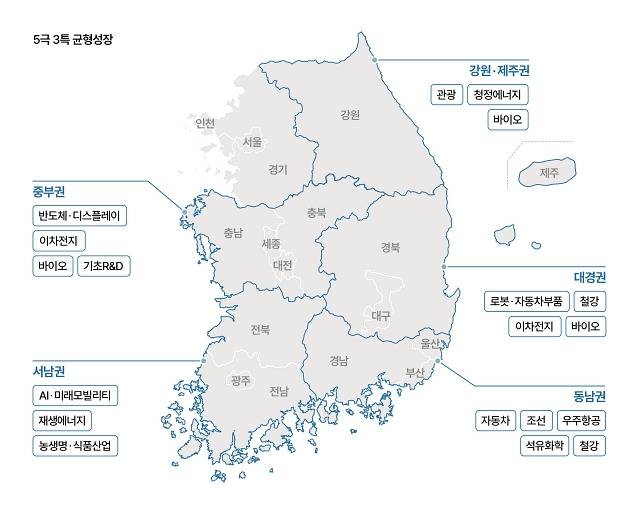 전국을 크게 ▲동남권(부산·울산·경남) ▲서남권(전북·광주·전남) ▲대경권(대구·경북) ▲중부권(대전·충청) ▲강원·제주권 등 초광역권별로 나누고 권역별 산업을 선정해 집중 지원합니다. 동남권은 자동차·조선·우주항공·석유화학·철강, 서남권은 AI·미래모빌리티, 재생에너지, 농생명·식품산업, 대경권은 로봇·자동차부품, 철강, 이차전지, 바이오를 미래 성장동력으로 키우는 방식입니다. 중부권(대전·충청)은 반도체·디스플레이, 이차전지, 바이오, 기초R&D 등을, 강원·제주권은 관광, 청정에너지, 바이오 등을 성장엔진으로 키운다는 구상입니다. 정부는 “구체적 성장엔진은 추후 지자체와 관계 중앙행정기관이 협의해 선정할 계획”이라고 설명했습니다.