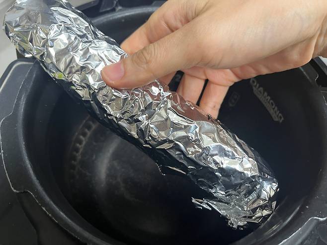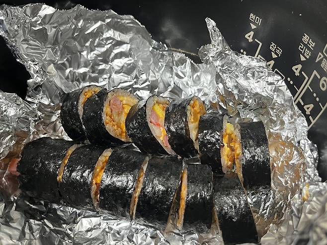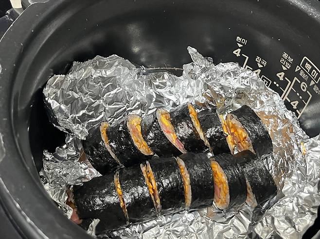 김밥을 은박지에 싸서 보관한 다음 그대로 밥솥에 넣습니다. 그냥 김밥을 밥솥에 넣는 경우, 김밥 속재료나 양념이 흘러나와 내솥이 지저분해질 수 있습니다.