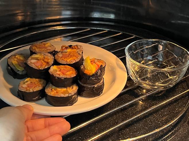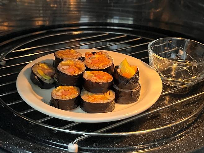 김밥을 데우는 가장 빠른 방법은 바로 전자레인지 조리인데요. 작은 그릇에 물을 담아 김밥과 함께 돌리세요. 그래야 수분을 보충할 수 있습니다.