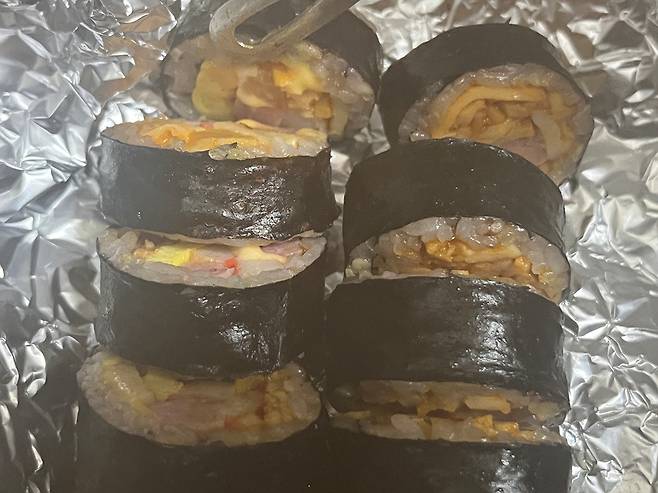 은박지는 풀어서 김밥이 보이도록 하세요. 은박지에 푹 싸둘 경우 수분이 맺히면서 김밥이 축축해질 수 있습니다.
