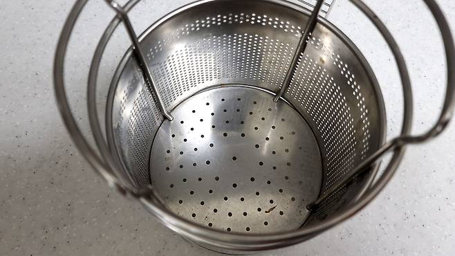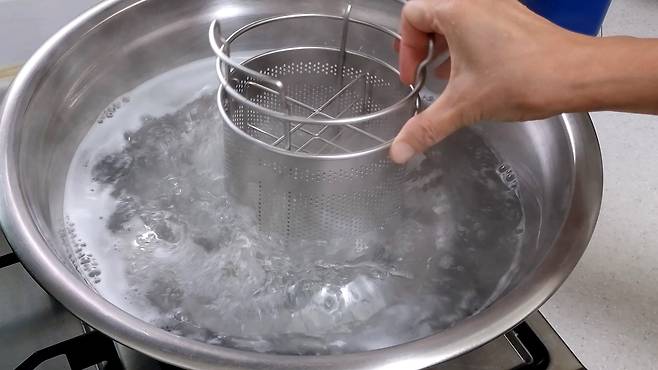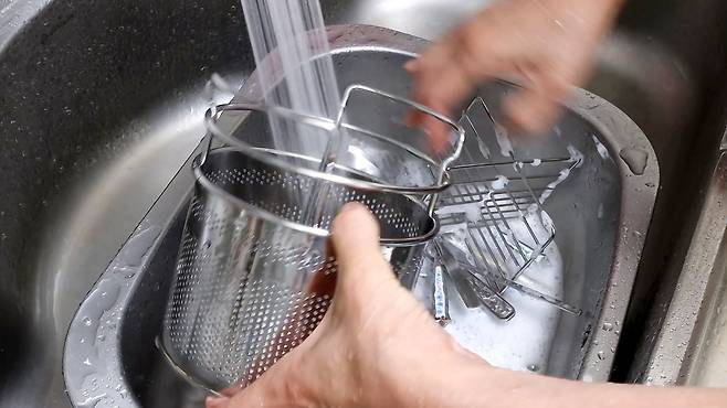 시간이 지나면 뜨거운 물은 버리고 바로 찬물에 담가 주세요. 이때 식기류가 굉장히 뜨겁기 때문에 조심하세요.