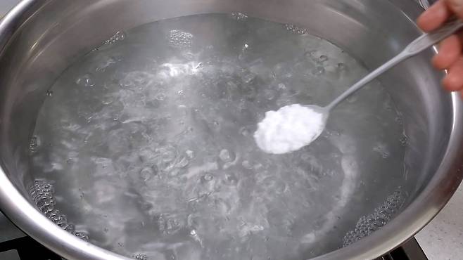 이럴 땐 먼저 팔팔 끓는 물을 준비해 주세요. 그리고 여기에 '베이킹소다'를 1~2스푼 정도 넣어 줍니다. 베이킹소다는 세척에 굉장히 놀라운 효과를 보여 준답니다.