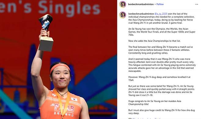 이어 "결국 안세영이 21-18로 경기를 마무리했다"며 "첫 아시아선수권 우승을 차지한 안세영에게 축하를 보낸다"고 전했다.