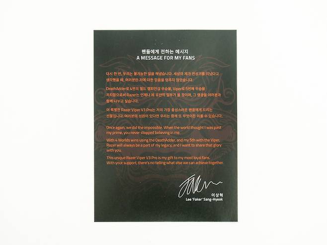 페이커는 단순한 프로게이머를 넘어 e스포츠의 아이콘이자 한국을 대표하는 글로벌 스타입니다. 그가 사용하는 장비는 단순한 도구가 아닌 그의 커리어와 성공의 일부이기에 이런 선수와 최고의 게이밍 기어 브랜드 레이저의 만남은 그 자체로 의미가 큽니다.