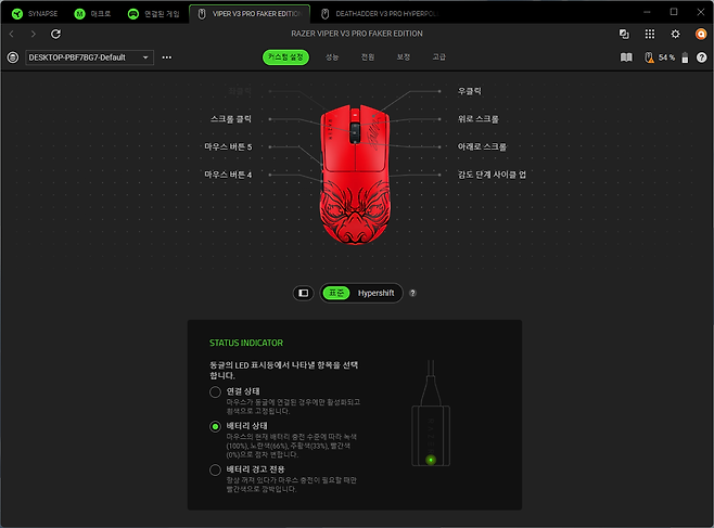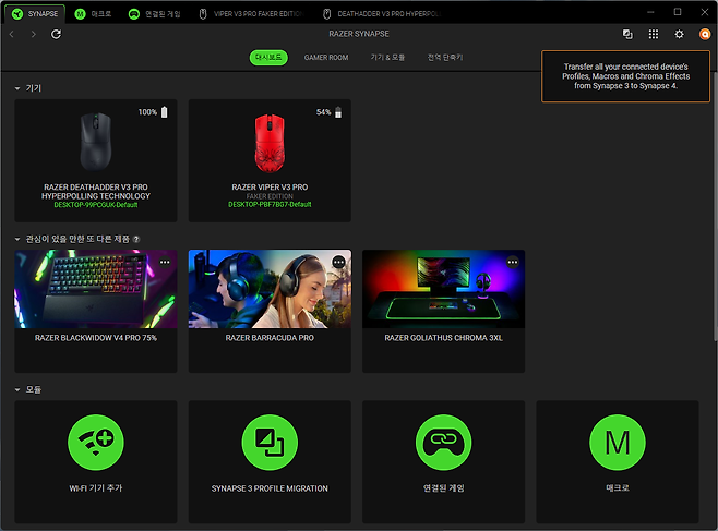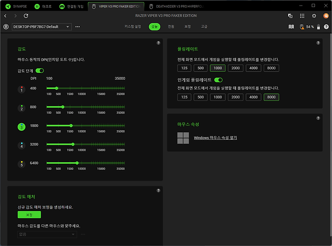 RAZER Synapse는 마우스의 모든 설정을 세밀하게 조정할 수 있는 핵심 소프트웨어입니다. 주요 기능은 다음과 같습니다: