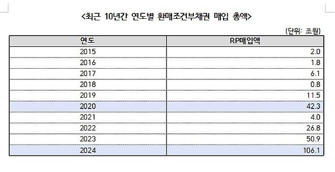 | ▲ 최근 10년간 한국은행의 연도별 환매조건부채권(RP) 매입 총액. |