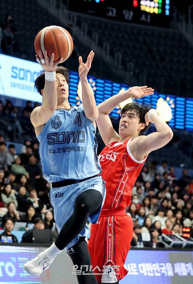 이재도가 몸을 틀어 박무빈의 수비를 피하며 슛을 하고 있다.