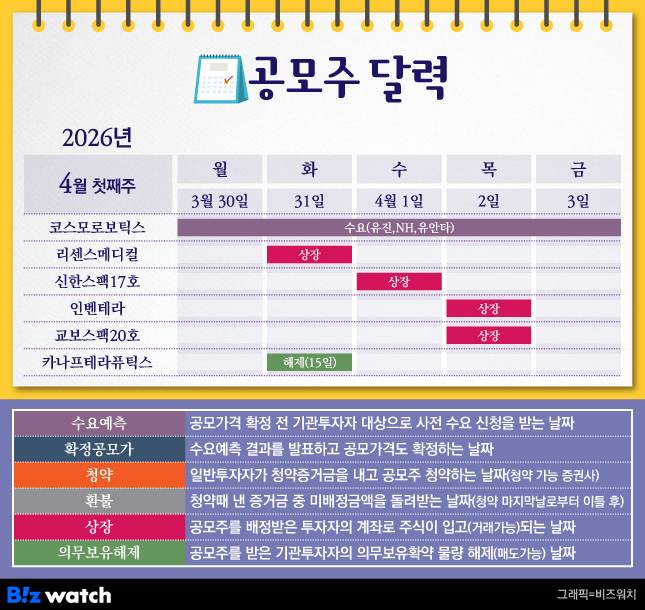 이번 주는 한 차례 일정을 미뤘던 코스모로보틱스가 수요예측에 돌입해요. 청약 일정은 따로 없지만, 리센스메디컬과 인벤테라를 포함해 총 4곳의 상장 소식이 기다리고 있어요.공모 일정 미룬 코스모로보틱스, 수요예측
