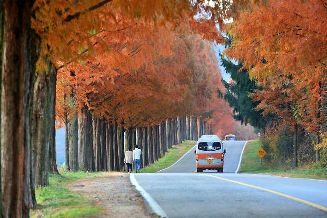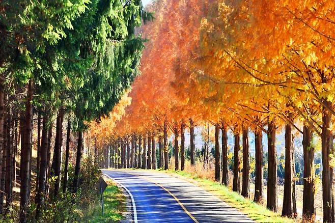 도로 양옆으로 높이 솟은 메타세쿼이아 나무들이 하늘을 가릴 만큼 울창하게 뻗어 있다. 가을 햇살이 나무 사이로 스며들면 길 전체가 붉고 금빛으로 물들고, 바람이 불 때마다 단풍잎이 흩날리며 마치 영화 속 한 장면 같은 장관을 만든다. 그 풍경에 감탄한 드라이버들은 저절로 속도를 줄이고, 차를 세워 사진을 찍는다.