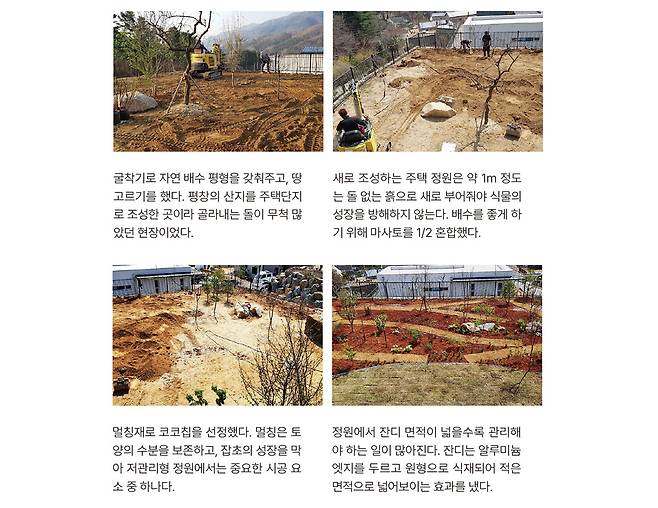한편, 일주일에 사흘을 살펴볼 수 있는 주말주택의 정원이기에, 그리고 부부가 은퇴 후 황혼기에 접어든 상황이기에 관리 소요와 강도가 높은 정원을 꾸리는 데에는 무리가 있었다. 저관리형 정원을 만들기 위해 이 대표가 제안한 것은 멀칭. 코코칩을 일정 두께로 깔아두면 흙이 습기를 오래 머금어 지나친 건조 상황을 예방할 수 있고, 무엇보다도 잡초가 멀칭 사이를 뚫고 나오지 못해 잡초 뽑는 노동을 크게 줄일 수 있다. 잔디정원 형태를 둥글게 해 체감 대비 실제 잔디 면적을 줄여 잔디 관리에 드는 노력을 줄인 것도 살펴볼 만하다.