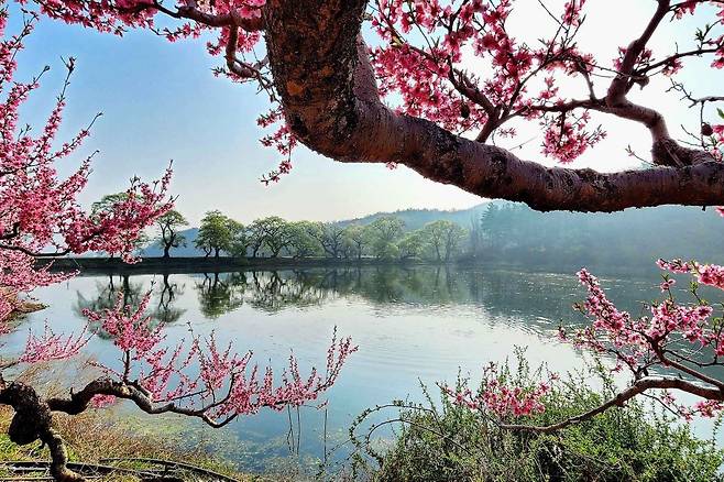 분홍 복사꽃과 어울린 반곡지의 봄 풍경 / 사진=한국관광공사 포토코리아@박무수